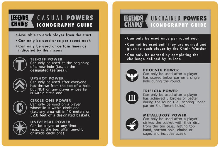 Det finnes 3 typer Unchained Power-kort, som holdes av dealeren (også kalt Chain Warden) frem til de blir tjent av spillerne. For å få disse kortene – og muligheten til å bruke kreftene deres – må spillerne først fullføre utfordringen som er angitt med ikonet (f.eks. å få sin første birdie).